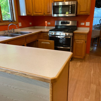 The old kitchen had outdated oak cabinets, less storage and worn out appliances. The homeowner wanted to freshen up the look of her kitchen by adding brighter cabinetry, new countertops and backsplash, as well as updated appliances and lighting. The homeowner also wanted to relocate her fridge and add a kitchen island to give her more counterspace and storage.